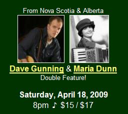 The next Folk Night, on April 18th, features two younger performers that I know we will be listening to for years to come. Maria Dunn (from Alberta) and Dave Gunning (from Nova Scotia) will each perform a set, and then combine forces for a few songs, in what is certain to be an inspiring night.